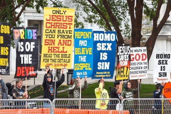 Both demonstrate how religious justification amplifies rhetoric targeting identity, whether that’s sexual orientation or the construction of political opponents as fundamentally “God-hating” rather than simply holding different policy views.