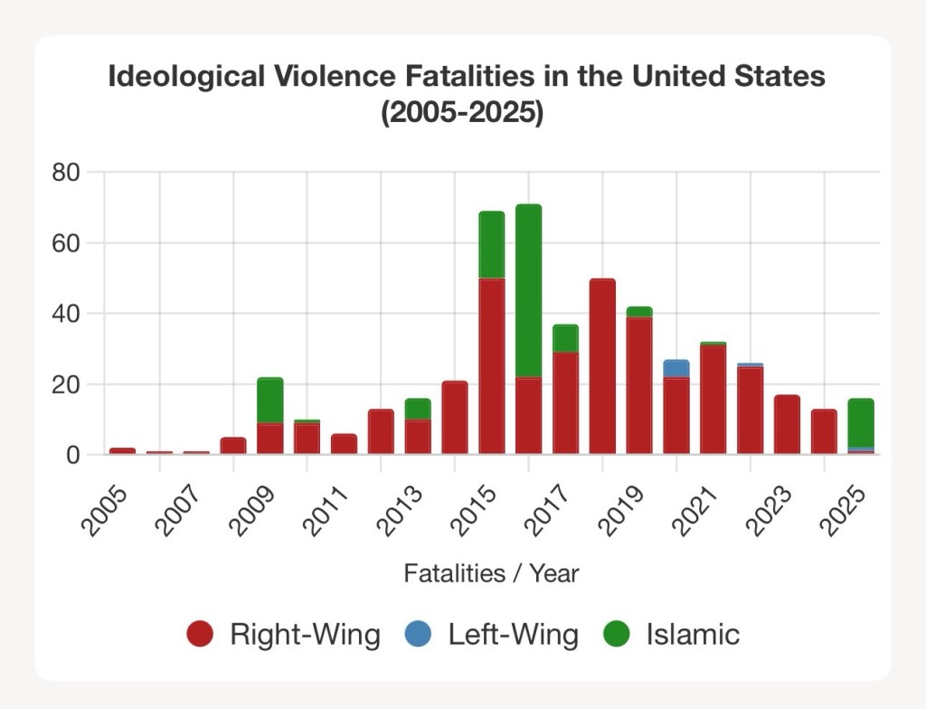 And this difference can be seen not only in the rise of hate-crimes against protected groups over the last several years, but in the stark reality that right-wing ideological killings since 2005 have outpaced left-wing by an order of magnitude.