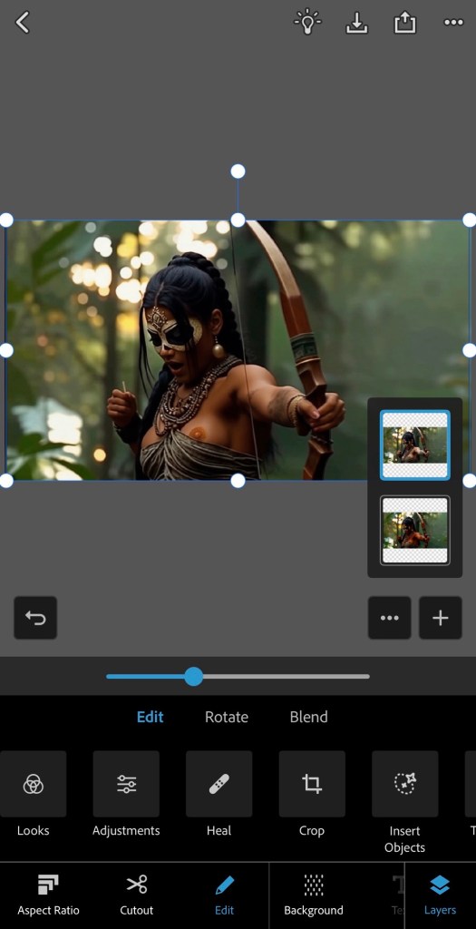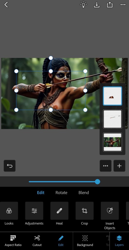 I also utilized PS Express for artifact cleanup and to create the wardrobe malfunction itself, since no AI system can parse “as she draws the bow her breast lifts, exposing a nipple.” I manually edited three keyframes showing the progression, then fed them as visual prompts back into Seedance. The AI interpolated the motion between my control points.