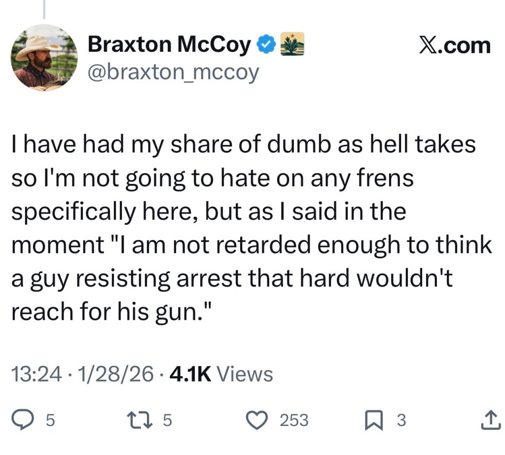 Pro-2A X/Twitter accounts like Braxton McCoy with 110,000 followers posted that Pretti’s murder was “Good shoot. It’s not even questionable.” And then added: “Also looks like [Pretti] reached for [his gun]. It wasn’t there but that doesn’t matter.”